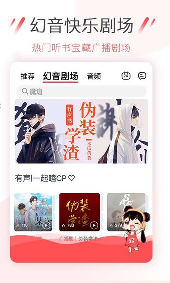 2、幻音剧场更新“剧集大礼包”,绿茶女主穿越后总装柔弱的《满级绿茶穿成小可怜》、养成系奶狗的甜美爱情《陈年烈苟》、《皓衣行》原着《二哈和他的白猫师尊》广播剧在幻音免废连载啦,快来收听墨燃和楚晚宁的神仙爱情吧!还有等更多有趣内容更新中