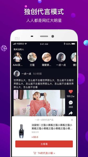 1、独创代言商品模式,人人都是网红大明星,你的视频可以创造更多价值。