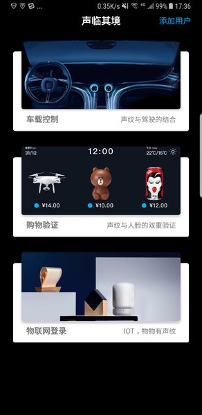 本软件是一款基于声纹识别技术进行身份认证的体验工具,应用于物联网各个场景之中,如车载系统启动、多媒体控制,声纹购物身份验证,家庭智能识别个性化设置。体验者需录入自己的声音,即可生成属于自己的声纹特征,即可进入各个场景中体验。