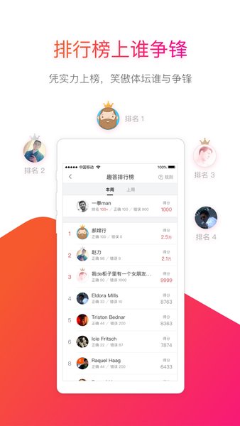 每日登陆获取答题次数,答对题目即可累积相应的分数,排行榜每周更新,快来看看你能排第几吧。