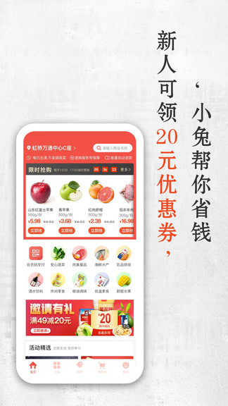 小兔买菜软件根据定位来获取最近店铺,几十分钟每日生鲜送回家,平台提供了十分详细的分类,用户可以在这里体验到一个十分舒适的选购体验,更有海量福利等你来领取!更多内容快来下载体验吧!