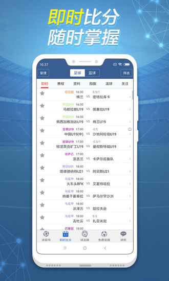 球探比分网足球即时比分手机版是一款可以免费看球的软件,在这里你可以参与到精彩之中,各种体育赛事,包括了篮球足球等等热门比赛,球探比分网-足球即时比分为你免费提供,喜欢球的你一定不能错过哦!
