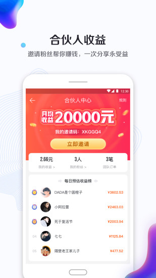 邀请合伙人加入,他的每笔订单你还能获得奖励,简单操作享受购物永久分成。