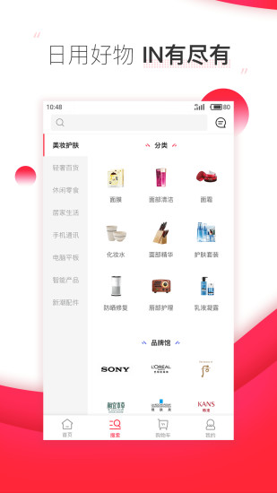 全品类一站式购物体验,覆盖3C智能、美妆护肤、个人护理、 食品饮料、居家百货、潮流轻奢等热销类别。