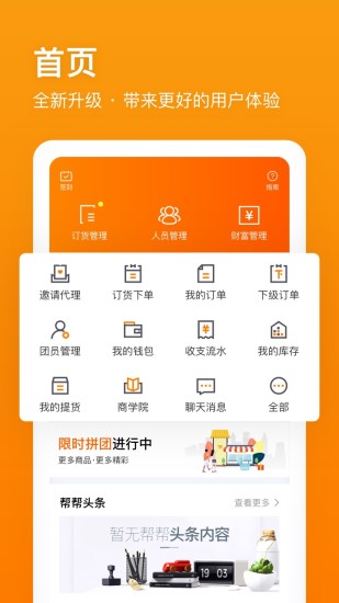 4.首页包括我的店铺、我的订单、团队管理、市场选货、我的上级、邀请代理等选项,可查看当日销售额、当日团队奖励等相关信息。
