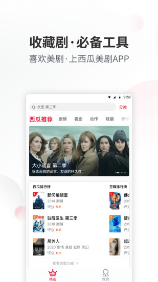 西瓜美剧是一款专注美剧的助手软件,美剧资讯、美剧档期、经典影评应有尽有,我们致力让每个爱美剧的能在这里找到所爱,如吃西瓜一般快乐!