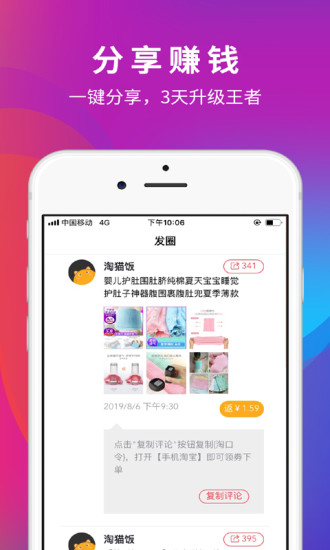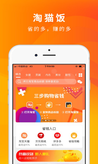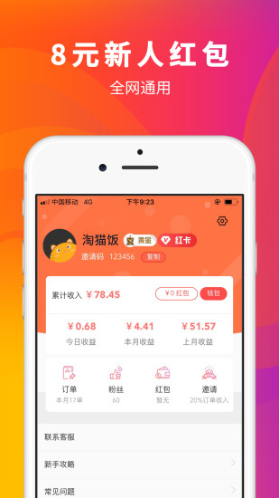 淘猫饭app是一款手机网上购物优惠折扣平台,里面有海量热门电商平台最新优惠卷信息,帮你网上购物省钱还可以赚钱哦,新注册就送8元新人红包一个全网通用,邻卷购物还可省高达90%,支持一键分享赚钱模式哦,赶快下载体验吧。