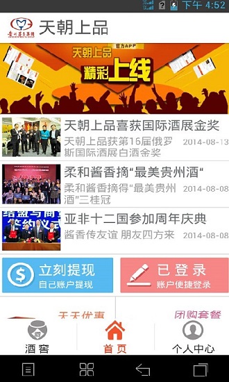 天朝上品由酒窖、首页、个人中心三大菜单框架组成,集推广、支付、互动为一体的全方位服务。酒窖共分为6个系列,分别是天朝上品系列、天下乐系列、中华商务系列、中华国礼系列、集团供应系列、商超供应系列。每个系列都汇集了相应酒品的商品参及详细描述,可点击立刻购买,每一款产品都有购买返利。