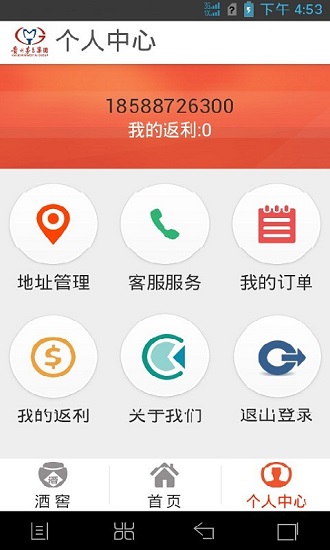 -个人中心包括账户管理、地址管理、客服服务、我的订单、我的返利和退出登陆几个模块,是后台管理的重要组成部分。这些功能除了“退出登陆”外,都要通过输入手机号来获取随机密码并提交来进行进一步操作。