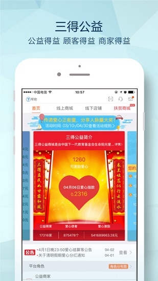 《三得商城》是一款通过全新消费激励模式进行资源整合,实现了公益基金协会得益、顾客得益、商家得益的三方互利共赢的购物软件。顾客可以通过消费可以获得奖励。软件通过分享和推广来整合自身的资源,让每个角色都能从中获益。