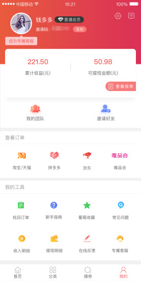2、你可以随时查看自己购买的订单以及订单的具体返利金额,并且这里提现非常的方便;