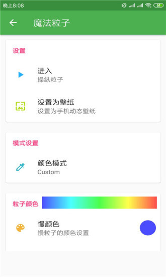 这是一款经典的粒子软件!应用中,你可以设置粒子的颜色,速度,力量系数等等参数,软件超酷的地方在于你可以设置你独立配置的粒子,并且可以设置为你的手机动态墙纸,还可以录制视频,经典大作,不容错过噢!