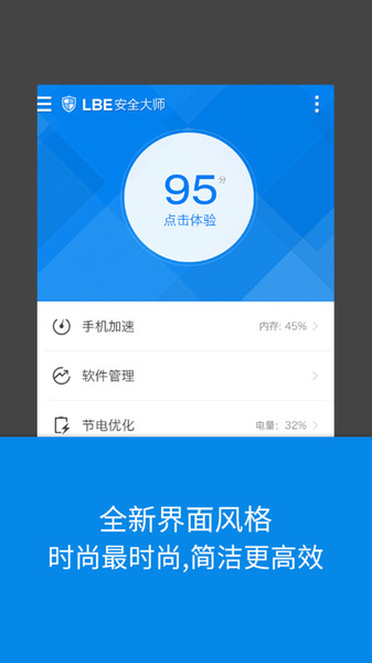 LBE安全大师是Android平台上首款主动防御式安全软件,简洁清爽的主题风格,为手机提供最全面的安全保护