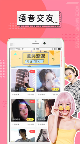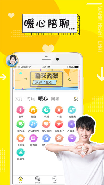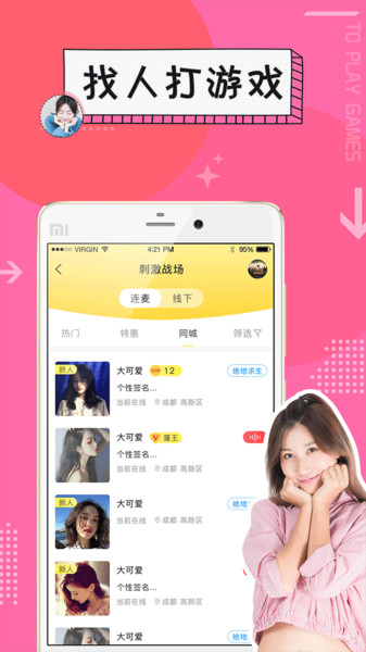 在伴心app约玩中线上线下多种形式可以选择,以电竞游戏切入点,提供英雄联盟、王者荣耀、和平精英、绝地求生、守望先锋、刀塔2等多款游戏,还有多重元素的娱乐类,包括声优聊天、声优pia戏、虚拟恋人、暖心树洞、声音鉴定、看电影、吃美食等;除此之外伴心还有“多人开放性聊天室”实时在线互动交友新玩法