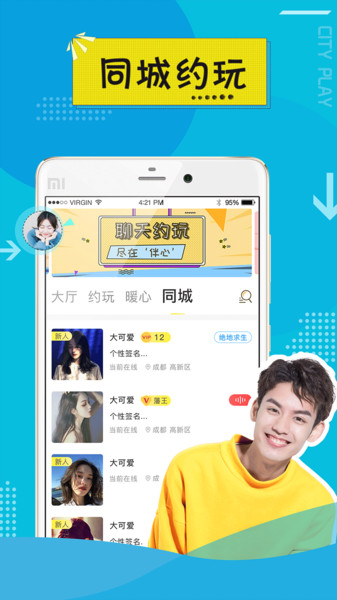 伴心app是线上语音视频社交应用,以语音聊天室,游戏竞技等线上线下分享技能主题互动,相互邀约,根据兴趣进行社交。伴心app,是一款"技能分享"约玩+聊天室的社交类app。在伴心app。聊天室、大厅游戏竞技等线上线下互动中,邀约到想约的人,比如:在游戏约玩中,有线上游戏连麦和线下约玩,相互确认进行邀约。