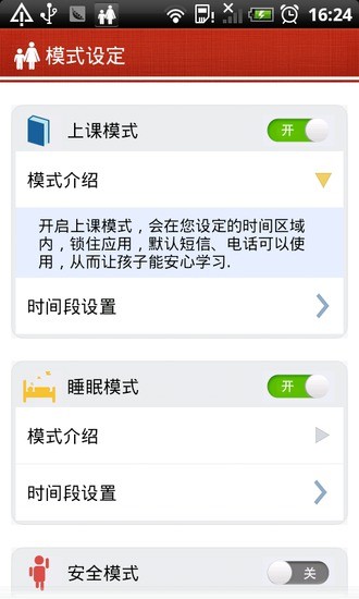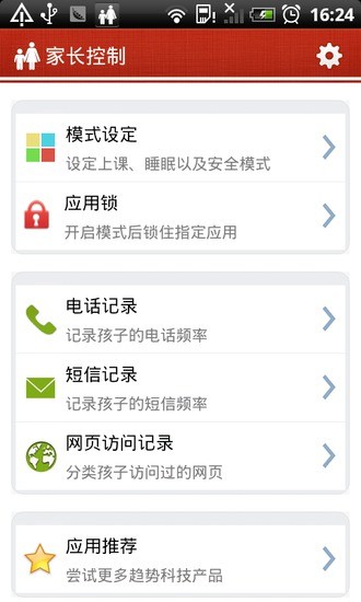 家长控制是一款帮助家长轻松管理孩子使用智能手机的软件上课模式和睡眠模式,会在指定时间内锁住应用;安全模式,会在孩子行走时提示不要使用手机;电话、短信以及上网记录,能帮助家长正确指导孩子的成长此外,新版本开设了学生桌面,在上课和睡眠期间,孩子只要进入学生桌面就能方便查看并使用家长开放给他们的应用;其余时间,学生桌面则自动消失并且直接进入系统桌面。