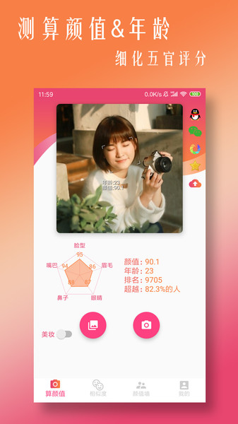1、拍摄一张照片,或上传一张手机中已有照片,稍等几秒,即可识测算出年龄和颜值。