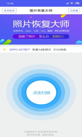 使用简单:手机无需root,无需电脑配合,无需专业人员指导,手机点击扫描即可恢复照片至相册。