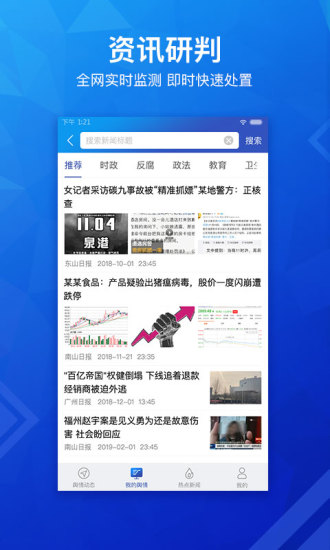 它能有效地对舆情进行监控,专业化十分强,软件通过大数据与人工监测相结合,对网络舆情提供周全服务,通过网络平台向用户推送,能让用户第一时间了解知道资讯新闻,提前做好准备。