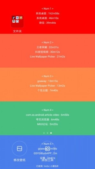 这是一款有意思的防沉迷应用…时刻提醒消耗在手机上的时间,点亮关闭间帮你记录时间,底部tips告知你当前状态,五彩壁纸随着使用时间逐渐变化,长按显示各个app的使用排名,时刻警示你放下手机!