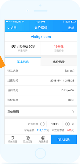 聚名网app是一款非常好用的查询域名手机客户端,用户能够通过本平台在线查询各大域名竞价情况,支持域名抢注、域名注册等一系列相关功能,让你在这里可以一站式就解决所有问题,还在等什么,喜欢这款软件就快来极光下载站体验一番吧!