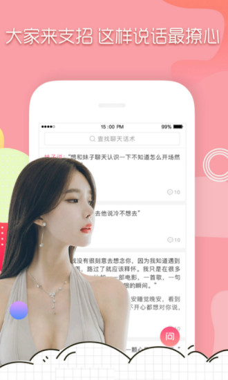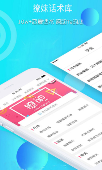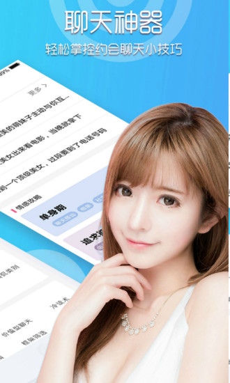 内置10W+约会聊天技巧、脱单聊天话术,让你轻轻松松搭讪心动女生,掌握聊天技巧,把握与妹子相遇的一瞬间,你的专属恋爱话术库,我们为您提供了海量有趣的聊天技巧,约会技巧,你再也不用感觉聊天很枯燥无味啦,轻松助你成功恋爱交友情话绵绵、轻松脱单。