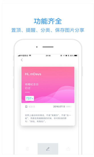 记忆日是帮您记录和管理重要日子的小帮手。您和恋人在一起已经多久了?距离重要的考试还有多少天?还要等多久才到发薪日?宝宝出生已经几个月了?应用会为您自动计算天数并提供通知提醒,让您不再错过任何特别的日子!