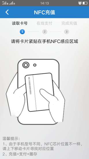 2、将公交卡放在手机nfc感应区域,由于手机型号不同,NFC芯片位置不一样,可以上下移动公交寻找对应位置,位置正确会听到“嘀”一声,对准该位置,请勿移开公交卡,读取卡号。选择充值金额进行充值