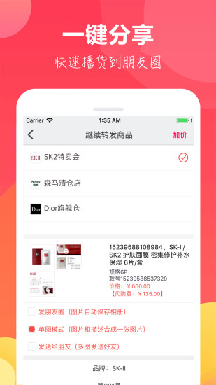 2、一键分享,快速播货到朋友圈,清晰认准你所需要的商品进行推广。