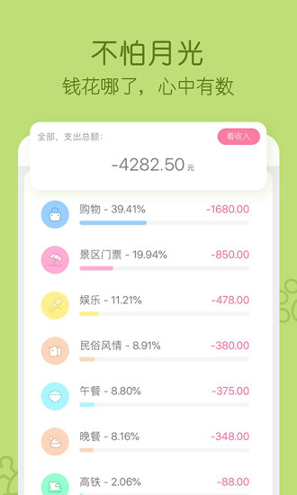 ·智能统计:图表展现各类支出收入,流水结余和收支汇总统计信息,账单心里更有底