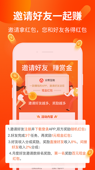 2、邀请好友注册下载APP,双?方奖励现?金?红包,好友完成3个任务后,再奖励1元红包。