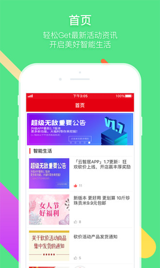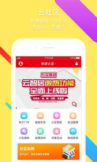 2.足不出户即可满足日常所需,物业水电煤气费缴纳、报事报修、衣食住行娱乐消费、智能产品采购统统一键搞定。福利社活动精彩纷呈,邻里互动嗨翻天,美好智能生活,尽在云智居。