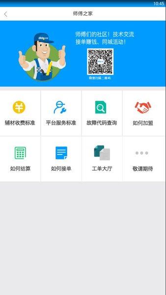 的咚师傅app手机版是一款家电维修服务上门解决的安卓客户端,帮助维修师傅利用空闲时间接单都是厂家直通单,结算周期15天让你收入翻一翻,耗材价更低品质有保障工作更省心,简单加盟简单接单赶快加入的咚师傅app手机端吧。