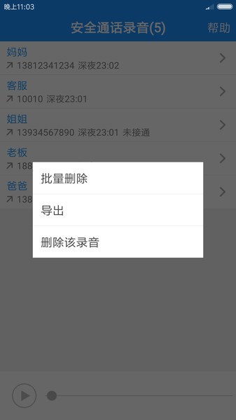 安全通话录音:界面简洁、功能稳定、安全可靠、可导出、批量删除。