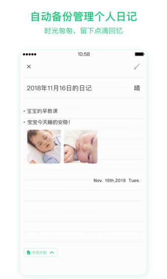 育儿日记:笔记、相册、计划等,每天的多种内容自动合成日记,查询查看方便。