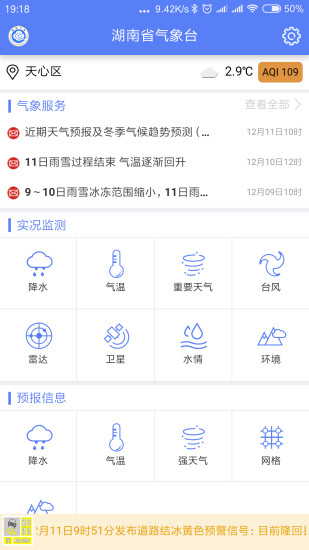 5、查询自动定位城市当前实况温度、湿度、风力风速、预警信号等信息以及5天预报、5天趋势,湖南省内城市还可查看3小时精细化预报。