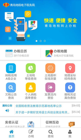 青岛地税掌上办税厅坚持以“便捷服务、安全快速”为宗旨,为辖区内纳税人提供随心、随时、随地的互联网办税服务。青岛地税掌厅app提供包括可视化城镇土地使用税地理信息查询、办税地图、纳税信用企业查询、欠税公告、真伪查验、征纳互动、预约办税、申报纳税、身份管理等多板块多业务的便捷服务