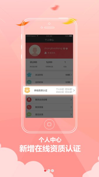 个人中心界面中显示会员的个人信息,包括优惠劵、保证金等个人资产,会员拍到的车、关注的车、出价的车,轻松了解账户情况。