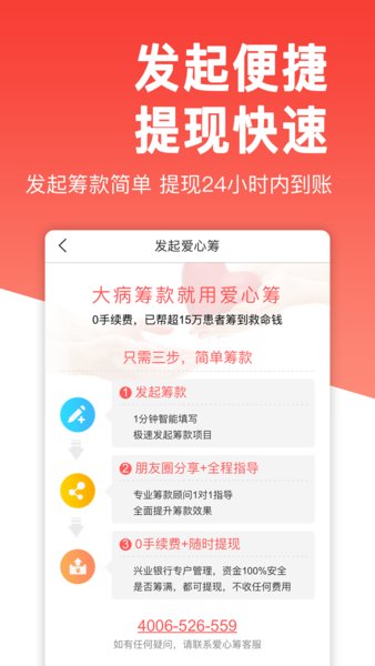 2、轻松发起,让努力自救的患者更幸运,只需三步:①发起项目 ②转发传播 ③结束提现。