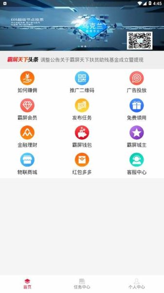 霸屏天下最新版是一款非常棒的分享赚钱软件,通过完成商家的任务来获取奖励,任务接取方式非常的简单,各种信息化资讯,转发收徒弟填写邀请码都能获得奖励,更多实用的特权礼包尽在极光下载站!