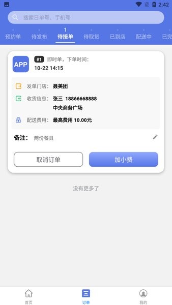 3、每天都有大量的订单提供,所有的配送员都可以自己查询订单信息,筛选自己需要的订单